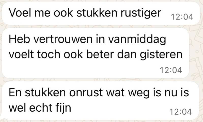 Ik ben met een opgelucht gevoel weggegaan, in mijn hoofd is het rustiger omdat ik kan stoppen met piekeren."