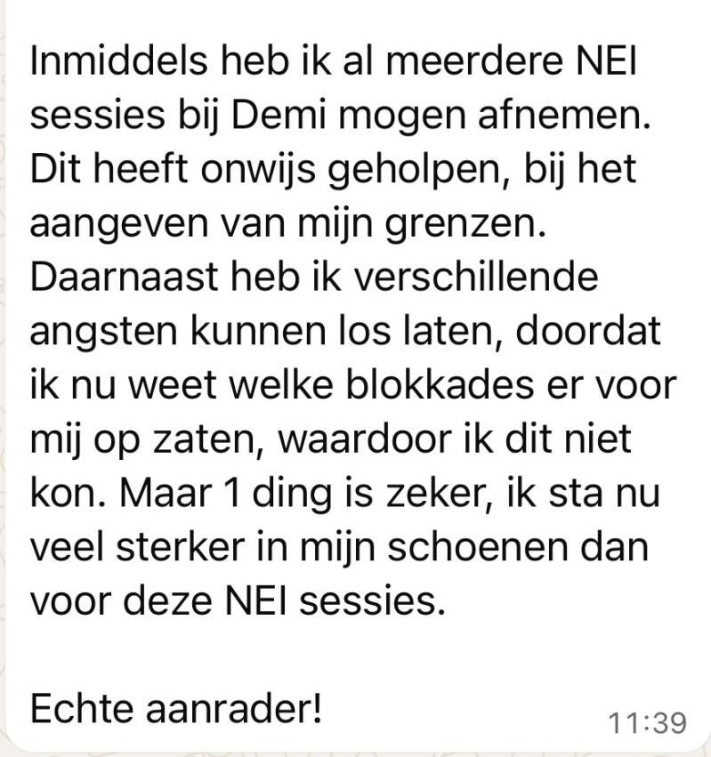 "Demi heeft me echt geholpen. Na het ervaren wat de kracht van NEI is, en na meerdere sessies, merk ik een enorm verschil in mijn doen en laten. Dit komt echt door de helderheid die ik heb gekregen na de sessies. Voor mij heeft het echt enorm geholpen! Dag controle, hallo vrij leven! "
